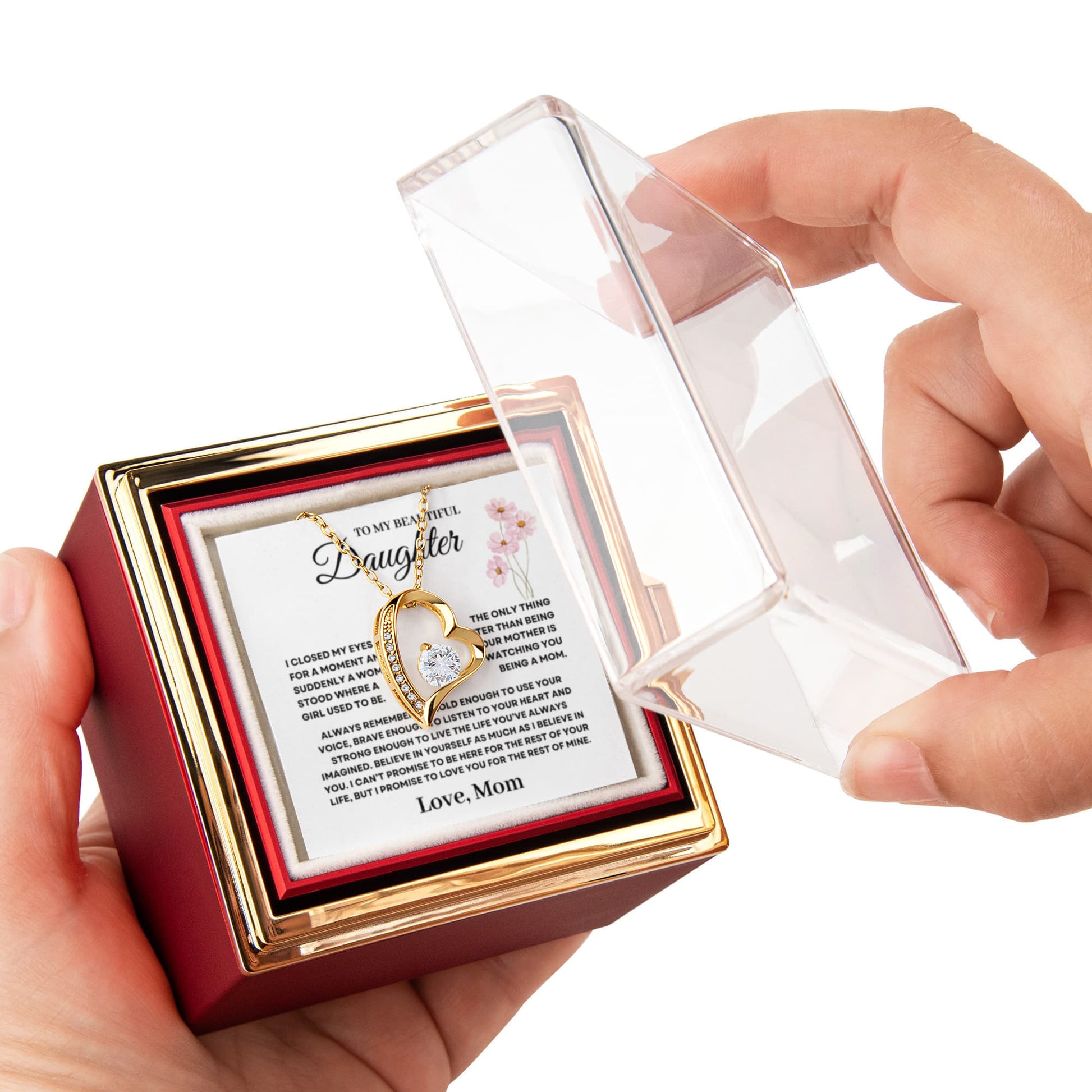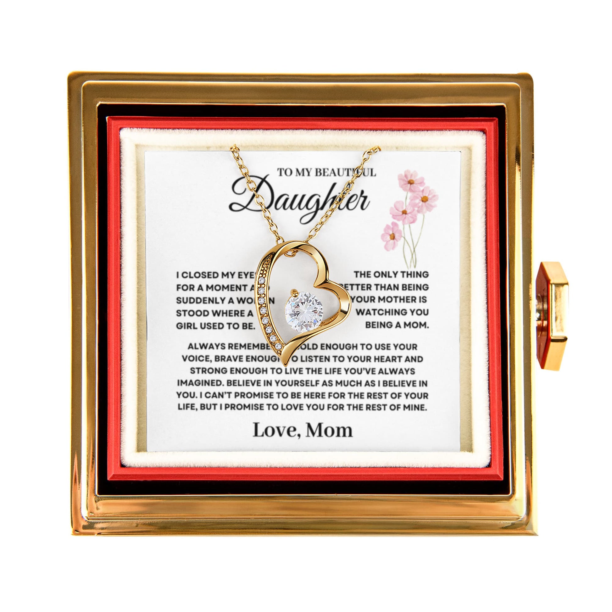Daughter Necklace from Mom, Forever Love Pendant with Rotating Rose Box, Gift for Birthday, Valentines Day, Graduation, Christmas